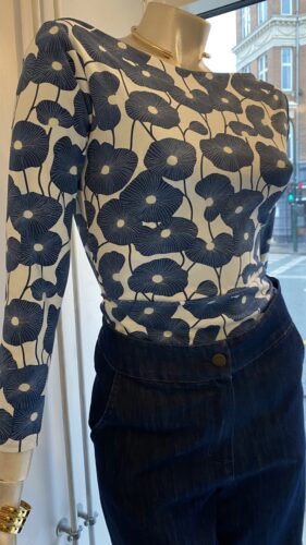 Bluse med bådudskæring og 3/4 lange ærmer, blå blomst på hvid bund