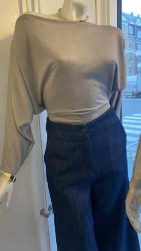Bluse med flagermusærmer, let strikket lysegråt stof med let sølv glimmer/lurex