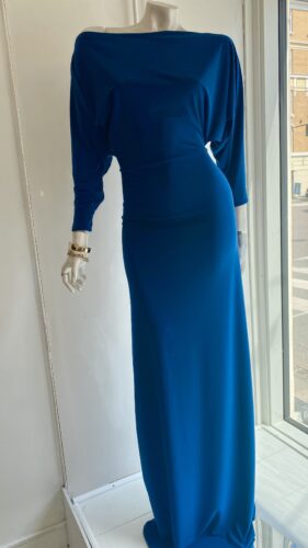 Lang kjole m v fortil og bindebånd på ryggen, petrol