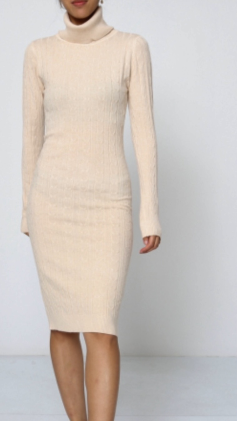 Kabelstrikket kjole med rullekrave og lange ærmer, creme