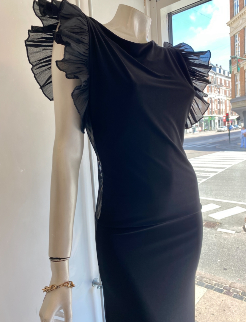 Kort kjole med flæseærmer og tyl/mol ryg, sort