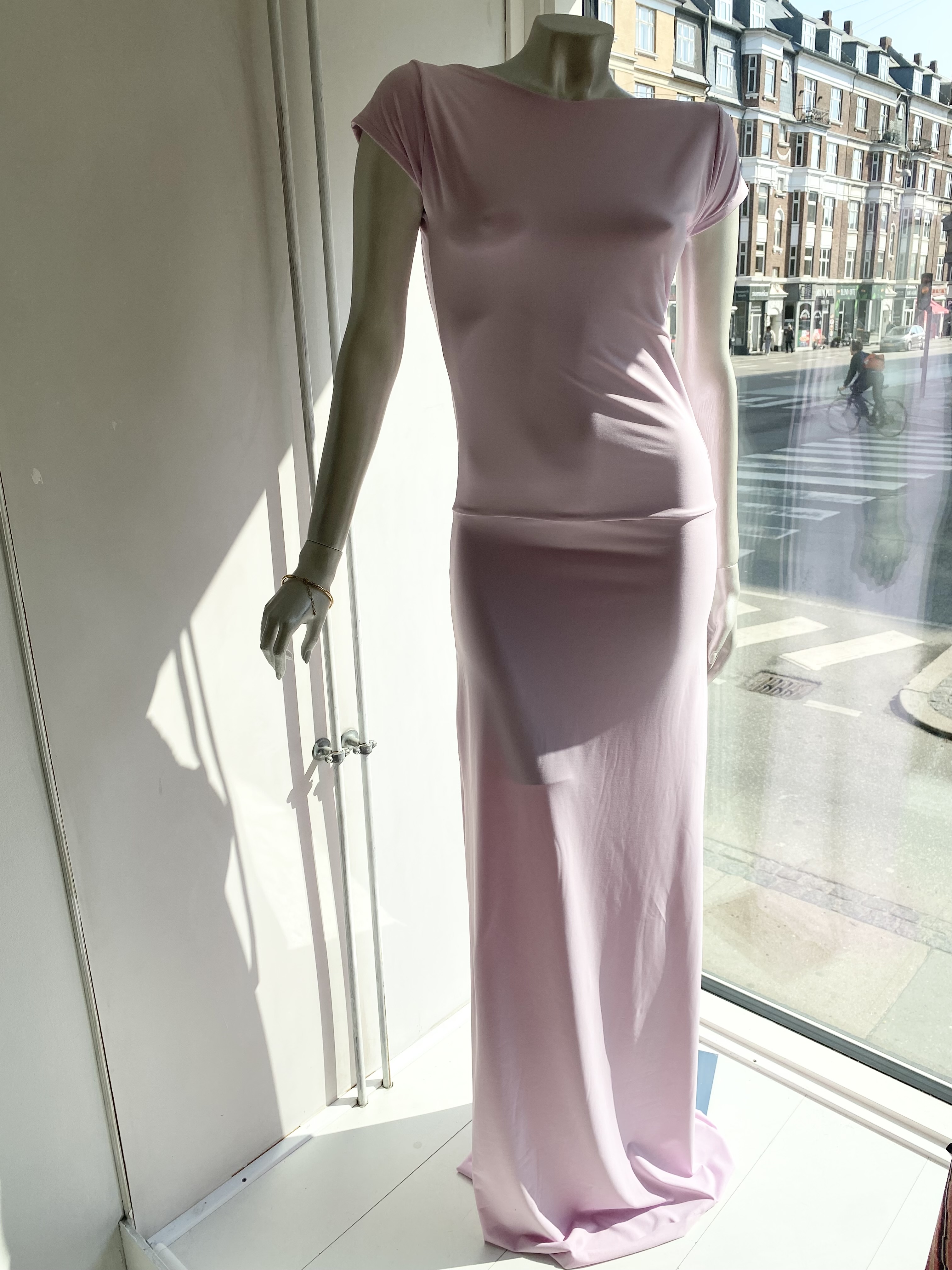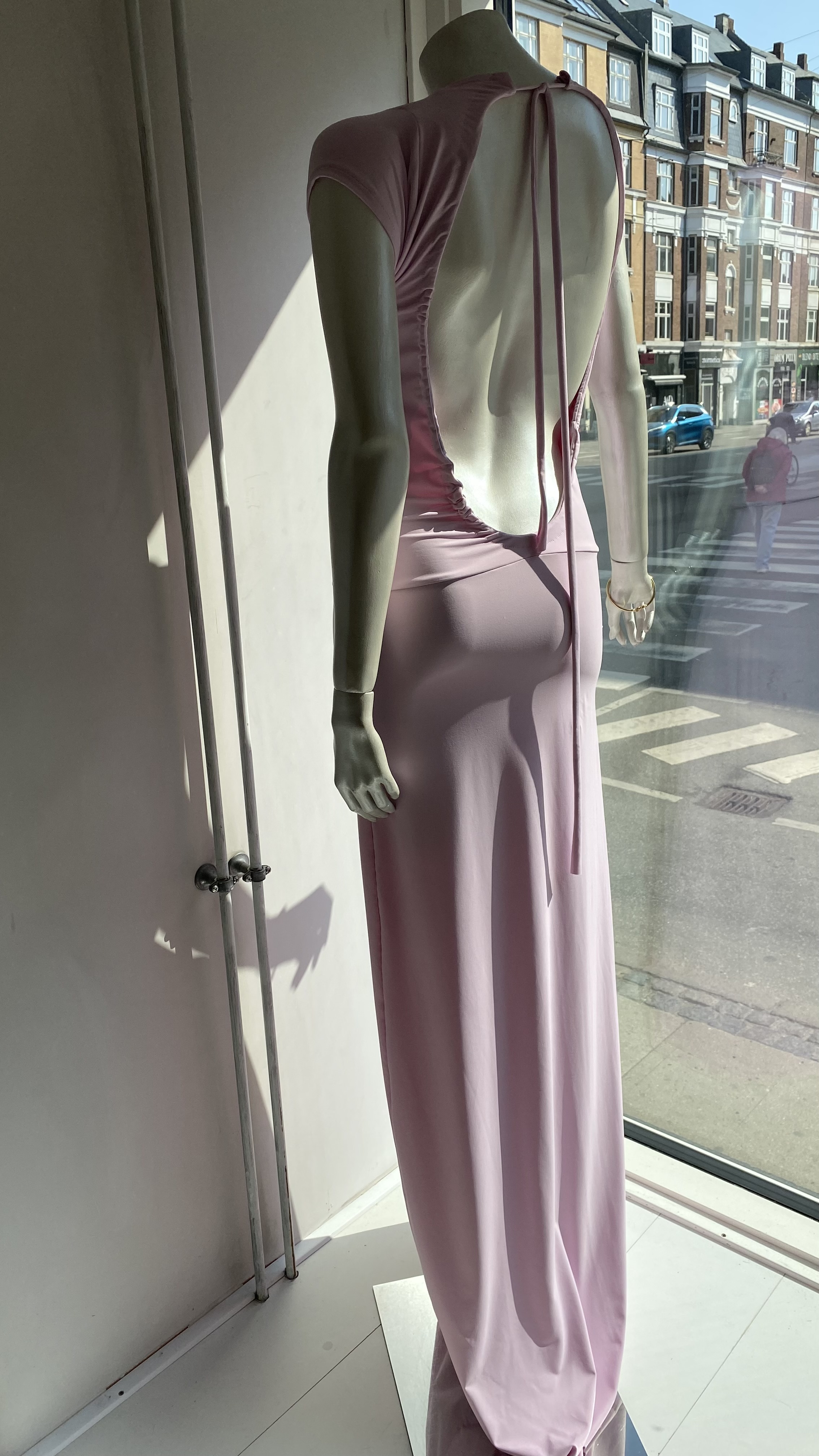 Lang kjole med kort ærme og løbegang i ryggen, rosa