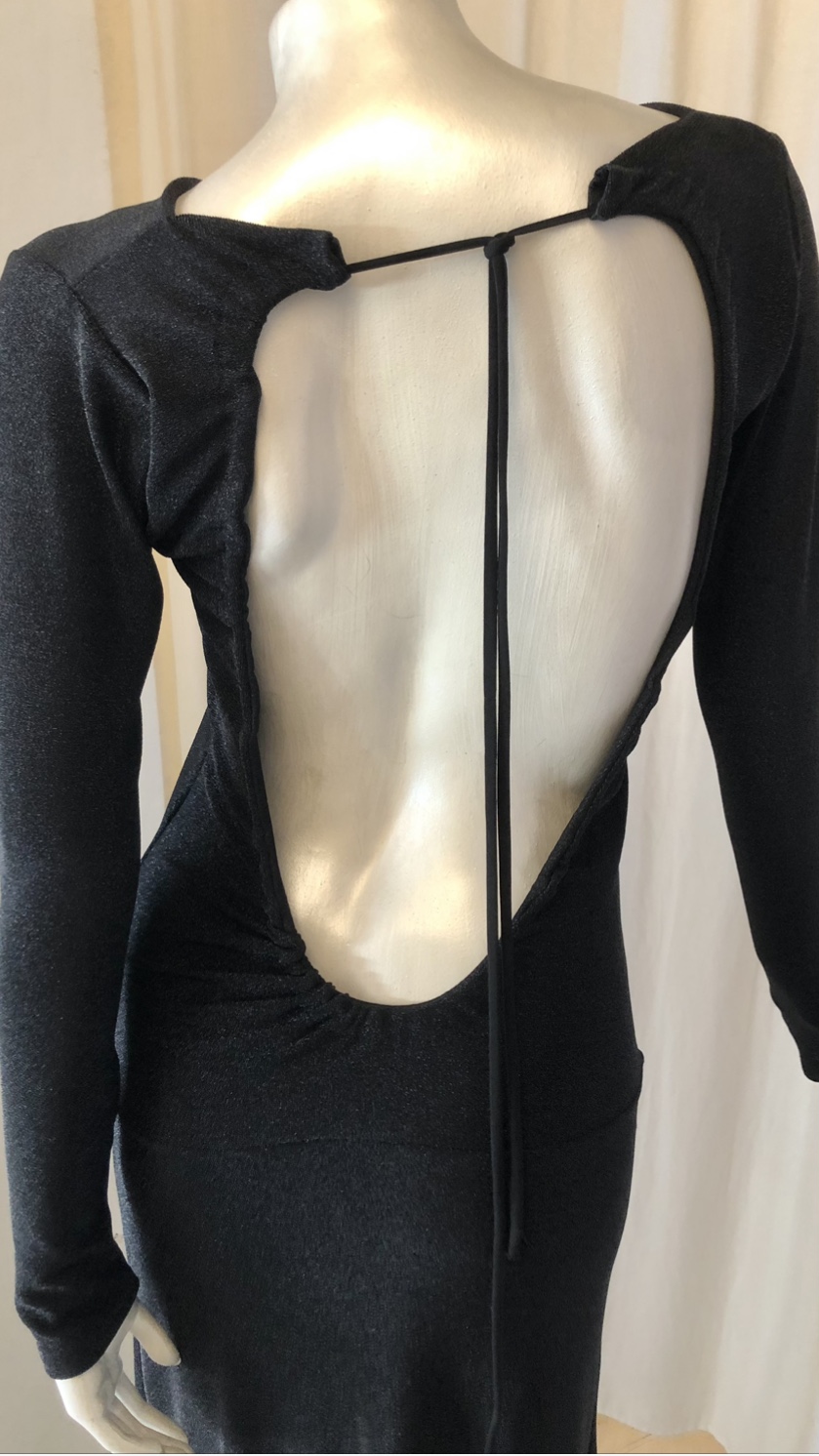 Lang kjole med lange ærmer og løbegang i ryggen, sort glimmer/lurex
