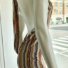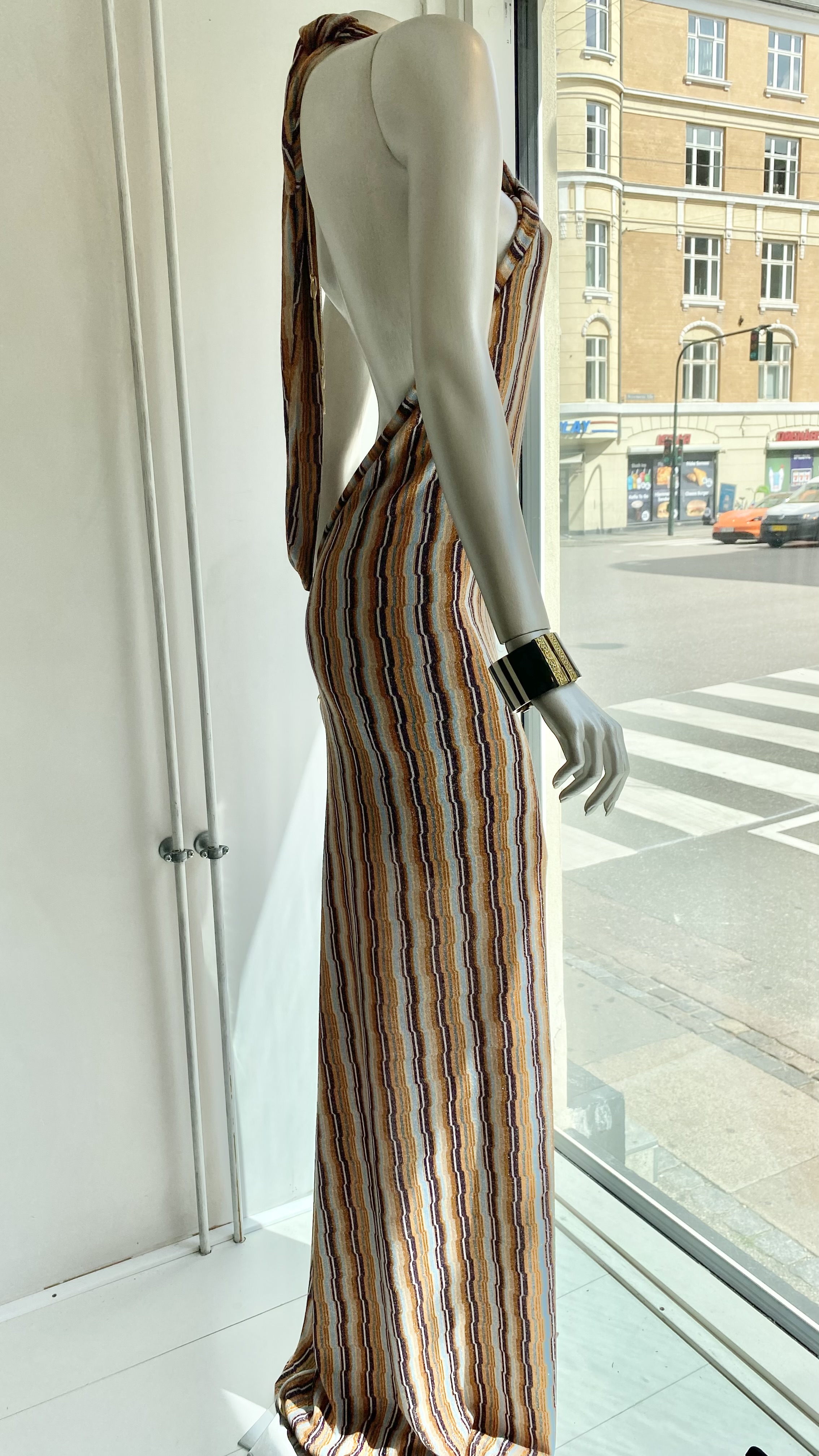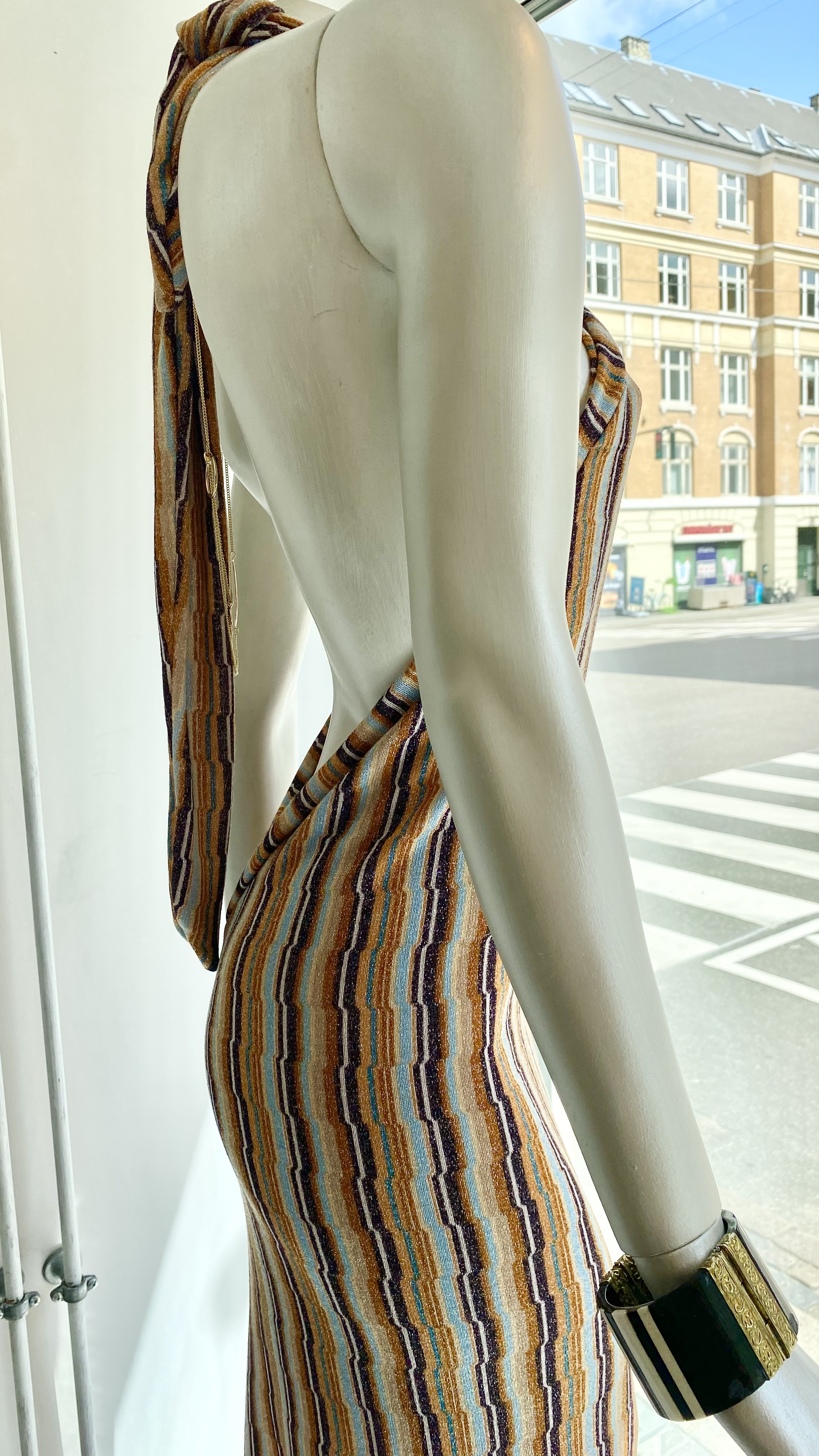 Lang kjole med tørklæde og bar ryg, brun og lyseblå glimmer/lurex